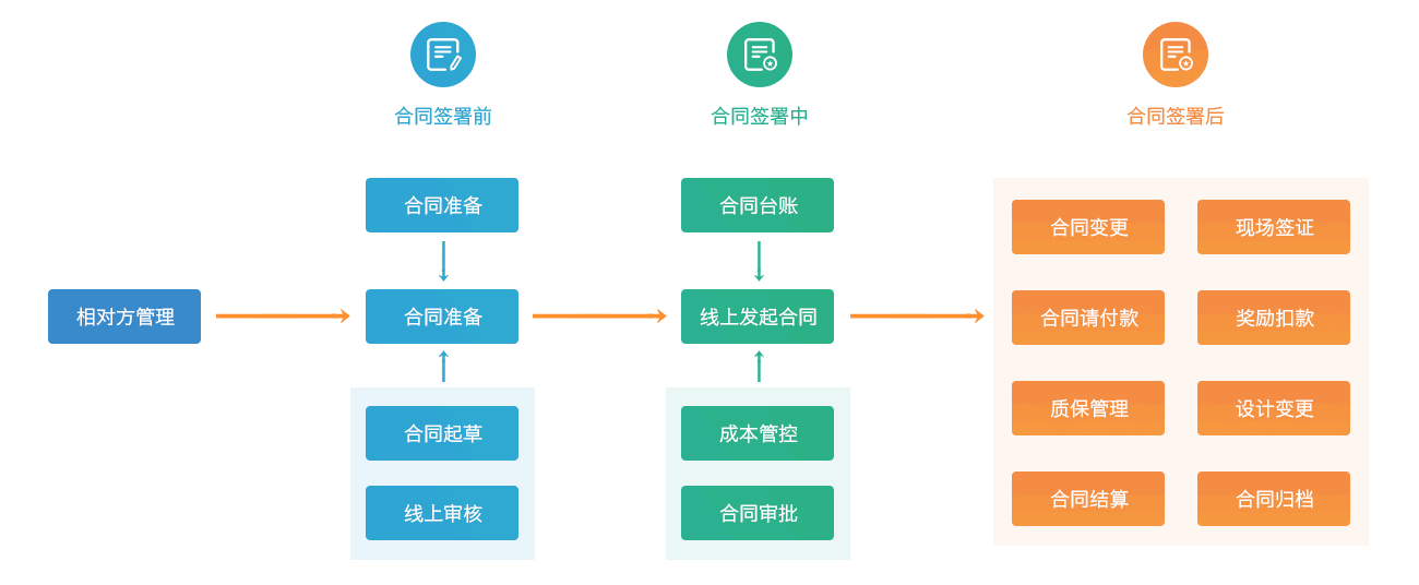 - 合同周期全程數(shù)字化管理,從合同簽署前準(zhǔn)備、合同起草、審批、結(jié)算至合同歸檔,整個(gè)過程數(shù)字化